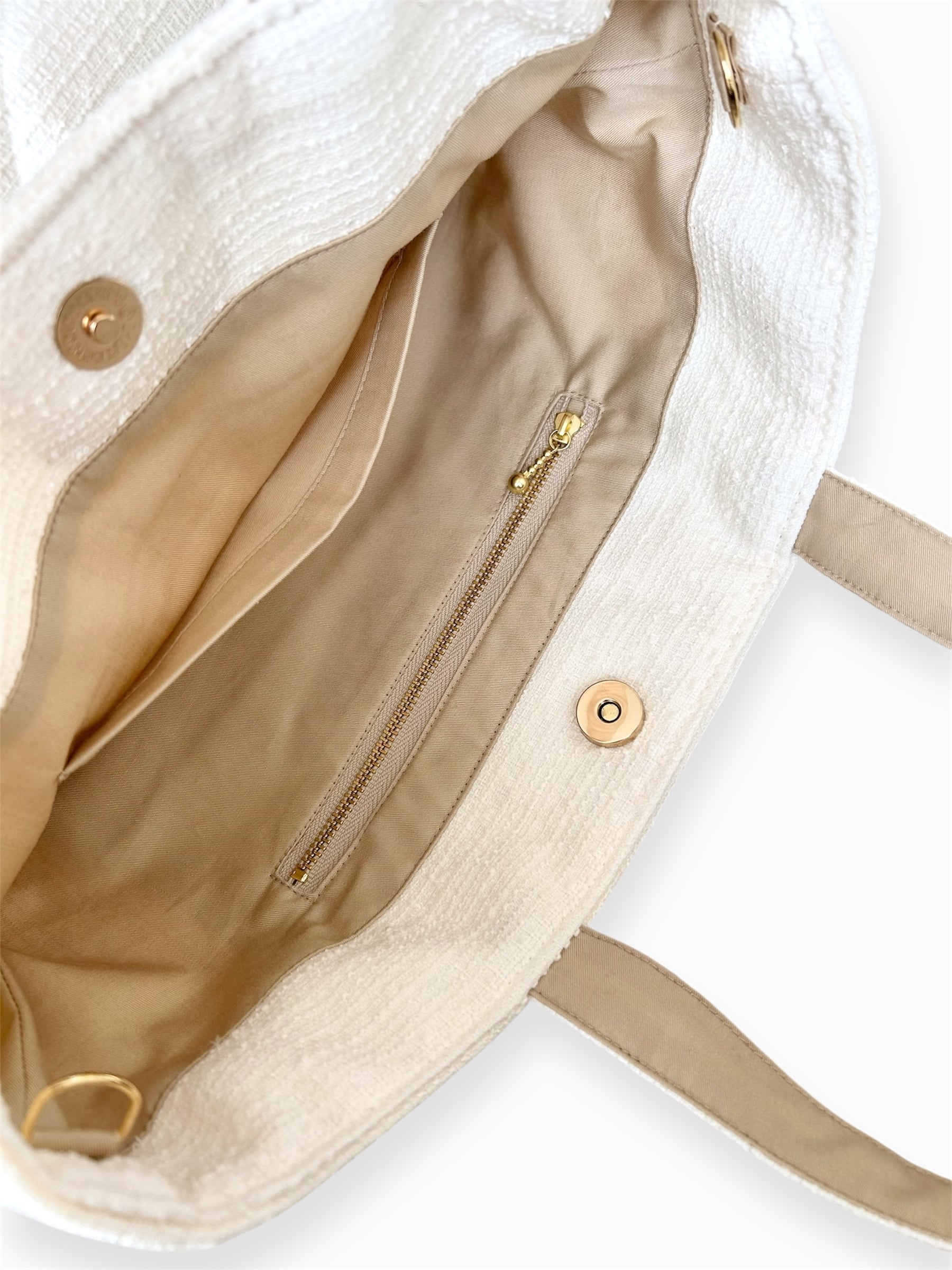 バッグの内側には便利なポケットとファスナーポケットがあり、小物の収納にも配慮されています。