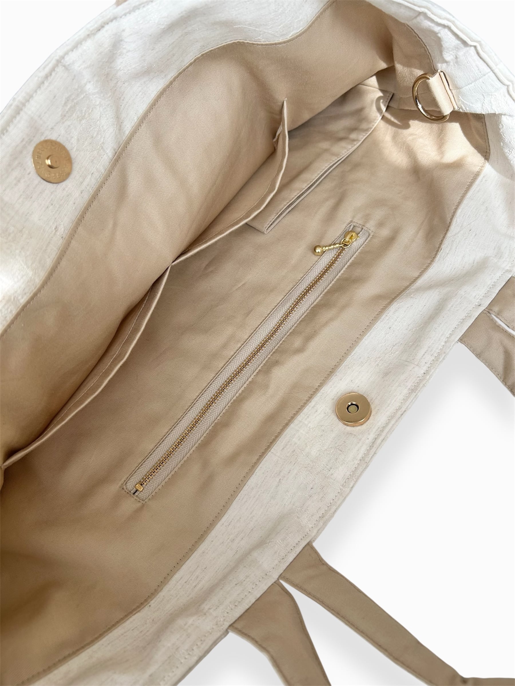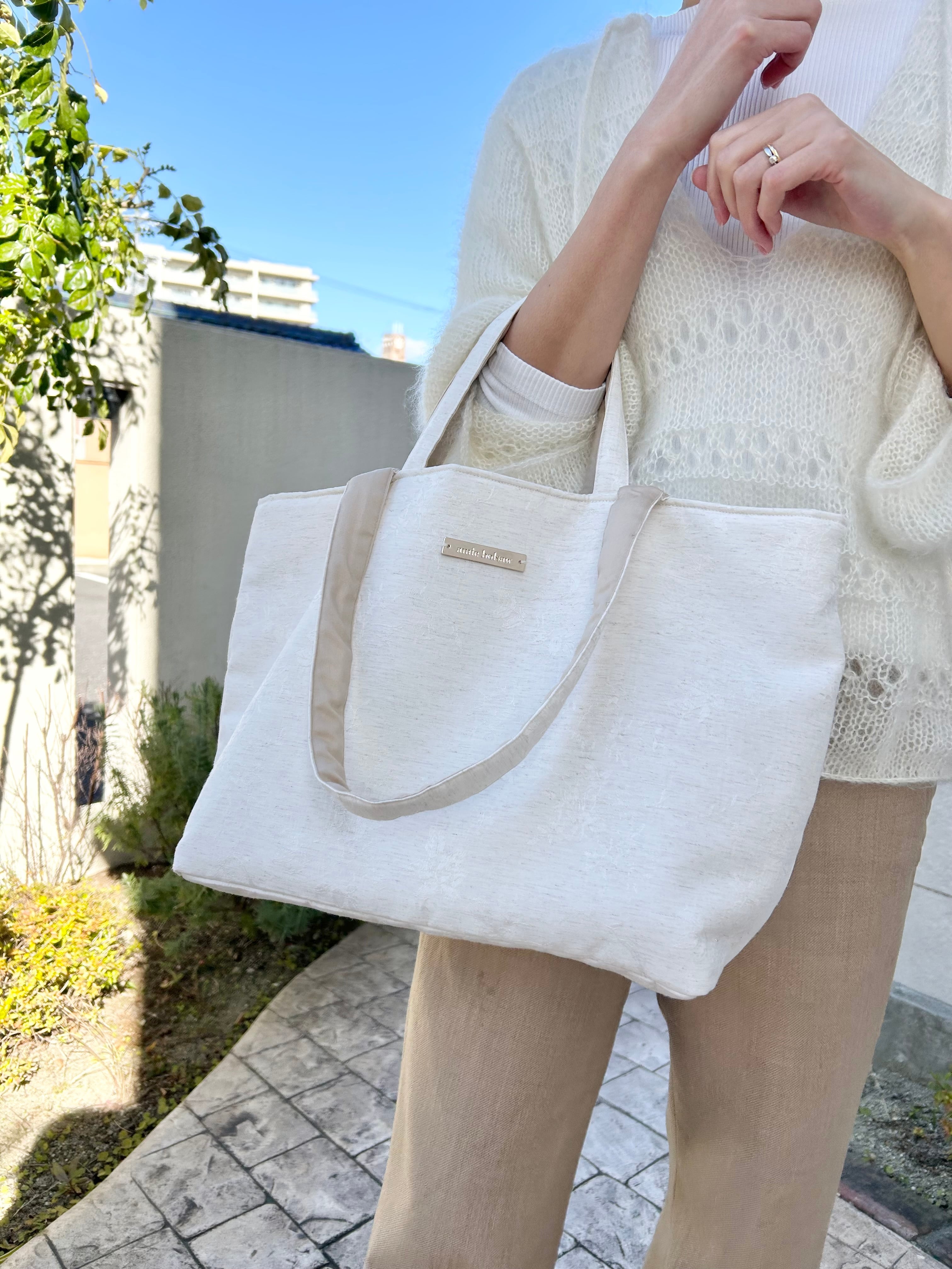 このトートバッグは、中にキルティング綿をいれており柔らかさがありながらも、トートバッグの形をキレイに保つよう考えて作られています。日々の使用においてもストレスを感じさせず、持ち運びも楽々です。